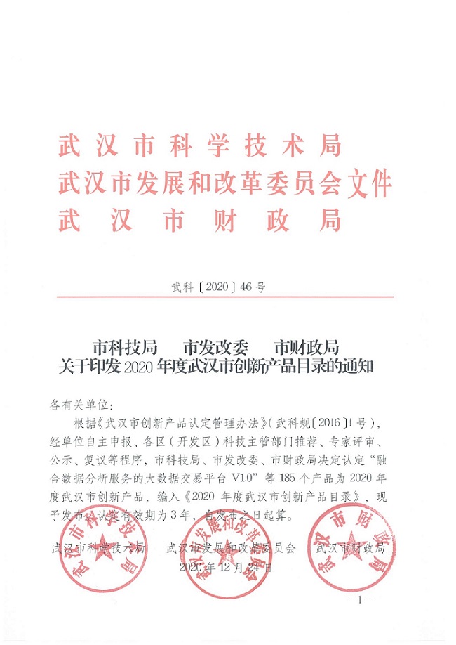 根据《武汉市创新产品认定管理办法》(武科规〔2016〕1号),经单位自主申报、各区(开发区)科技主管部门推荐、专家评审、公示、复议等程序,市科技局、市发改委、市财政局决定认定为2020年度武汉市创新产品,编入《2020年度武汉市创新产品目录》,现予发布。认定有效期为3年,自发布之日起算。