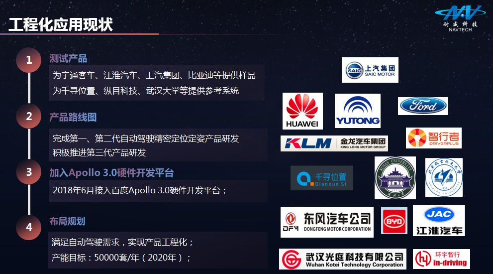章红平先生的专题报告介绍了武汉迈普时空导航科技有限公司以及母公司北京耐威科技有限公司的基本情况,迈普时空具备“惯性+卫星+组合”全覆盖的全产业链自主研发生产能力,并依托母公司耐威科技进行产业链全面布局,正致力于成为全球定位定姿解决方案的先进企业。迈普时空依靠武汉大学卫星导航定位技术研究中心,由中国工程院院士、“千人计划”、“长江学者”、海外归国共5位专家联合创立,目前申请了十余项专利,注册软件10套,其中,拥有自主知识产权的“高精度定位定姿数据处理技术”、“精密轨道测量技术”、“自动驾驶精密定位定姿终端”等技术已在全国二十多个城市开展了有效服务。